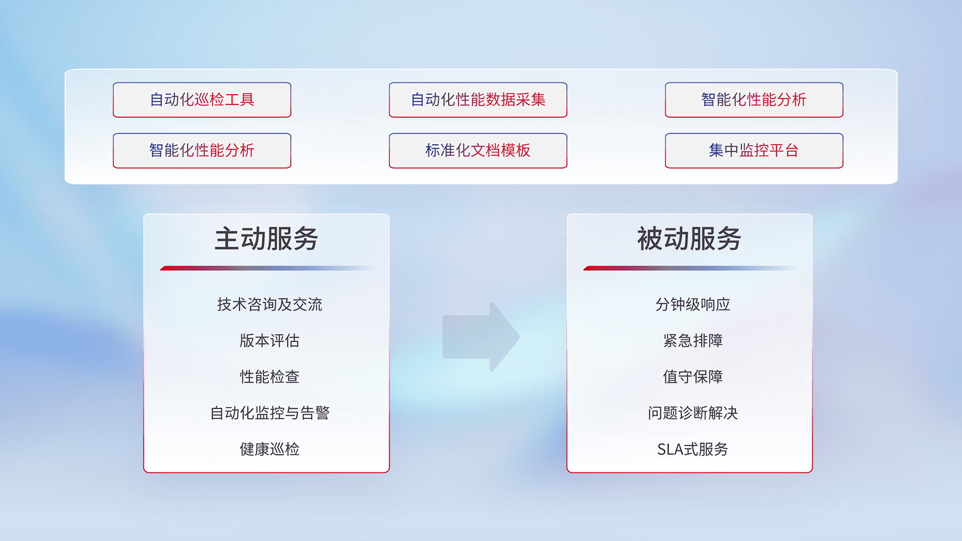 智能化工具和标准化文档,,,,保障服务质量,,,提供主动服务(包含技术咨询、、、、版本评估、、性能检查、、、、自动化监控与告警、、、、健康巡检)和被动服务包含(分钟级响应、、、紧急排障、、、、值守保障、、问题诊断解决、、、、SLA服务)。。。。